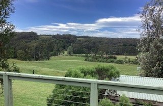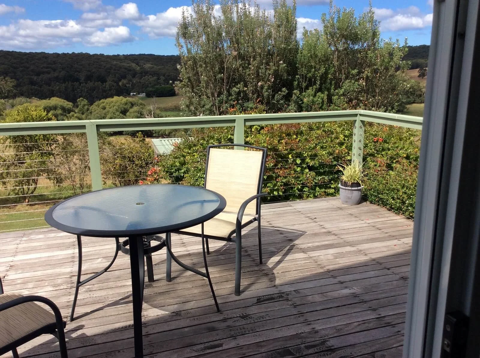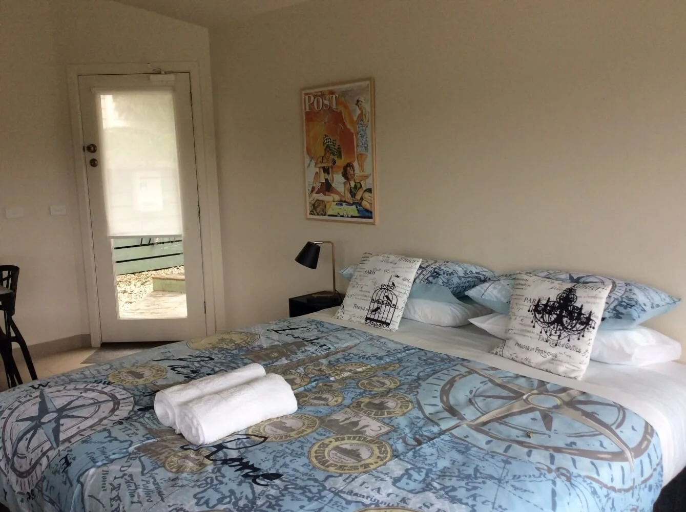 The stand alone Blue Wren is our “bijoux” studio with floor to ceiling windows, a king-size bed and a cosy interior. The very spacious deck allows our guests to relax (with a glass of their favourite beverage) and soak up the ambience of our rural property.