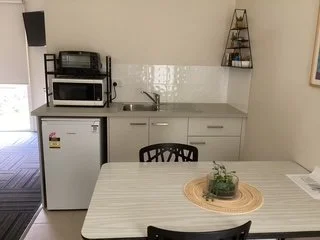 Small kitchenette (fridge, microwave, toaster, kettle, sandwich maker, basic cutlery and crockery) but no cooking facilities
